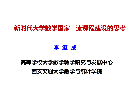 李继成教授作了题为《新时代大学数学国家一流课程建设的思考与实践》专题讲座,围绕国家一流课程建设、大学数学课程建设、数学教学团队建设三方面展开讲座。在国家一流课程建设方面,他指出2018年新时代全国高等学校本科教育工作会议的召开标志着高等教育开启了新时代,并从国家政策指导、“五类”国家一流课程、国家一流课程申报和评选标准、教育部组织教学创新大赛等方面详细阐述了国家一流课程建设的重要性和必要性;针对大学数学课程建设方面,他谈到不仅要把握好教学内容组织、教学过程实施、教学效果评价和教学团队建设四个重点,同时还要注重课程体系建设、教材建设、教学改革、课程资源建设、课程思政育人等方面;随后,李继成讲到数学教学团队建设,他指出国家一流课程的建设离不开教学团队,一流的教学团队建设是国家一流课程建设的保障。最后,他对大家寄予了殷切希望,并诠释了教书育人的内涵——职业层面上勤奋认真,事业层面上追求卓越,艺术层面上形成特色。