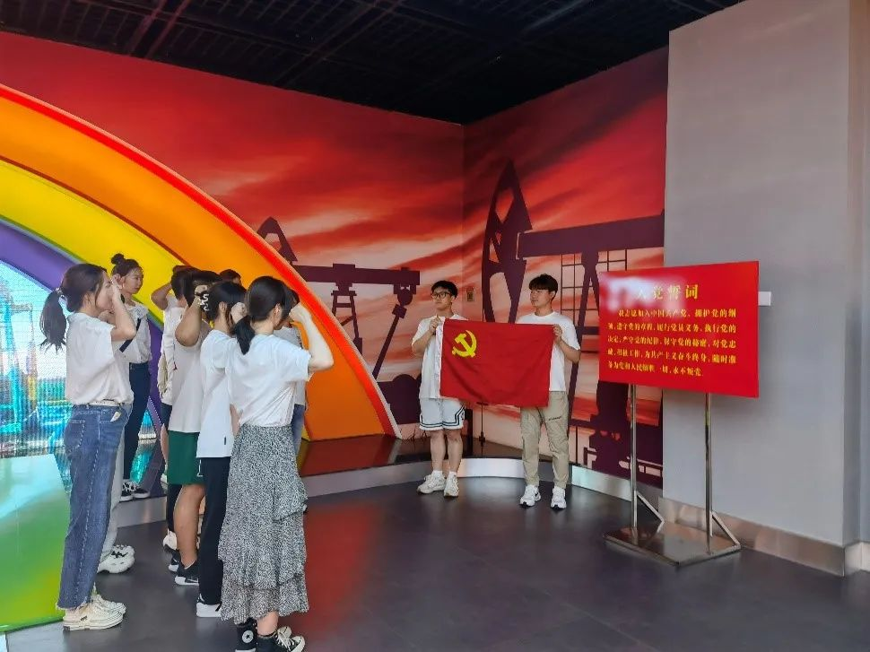 学生党员们在鲜红的党旗下重温入党誓词,庄严宣誓,承诺继承革命前辈的遗志,弘扬大庆精神铁人精神,将自己的青春献给中国特色社会主义事业。除参观学习外,还进行了互动交流,分享并感悟自己近期的学习、工作和生活,共同探讨如何更好地跟党走,在实现中国梦的征程中做出自己的贡献。