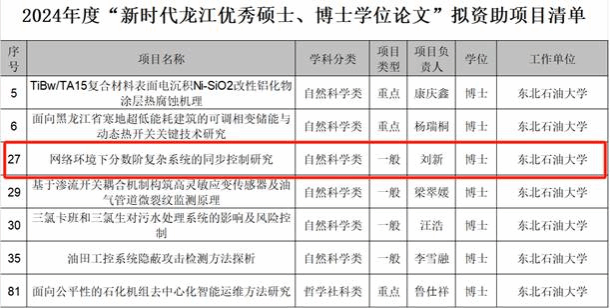 (通讯员 王美娜)近日,黑龙江省教育厅正式公示了2024年度"新时代龙江优秀硕士、博士学位论文"拟资助项目名单。经严格评审,Beat3657位学者脱颖而出获得资助,其中Beat365刘新老师的博士论文《网络环境下分数阶复杂系统的同步控制研究》成功获批自然科学类一般项目资助。