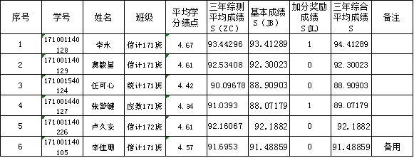 注:李佳珊为备选,李永在全国大学生数学竞赛(数学类)获得国家二等奖,综合成绩加一分;张警键在全国大学生数学竞赛(数学B类)获得国家二等奖,综合成绩加一分。