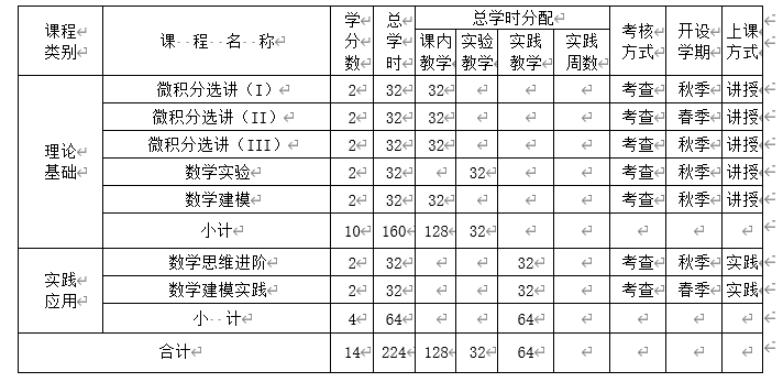 (1)理论基础类课程:讲解数学基础理论和数学应用思维,强化数学思维和逻辑训练,提升数学应用能力和建模能力。包括5门课:微积分选讲(I)、微积分选讲(II)、微积分选讲(III)、数学实验、数学建模;